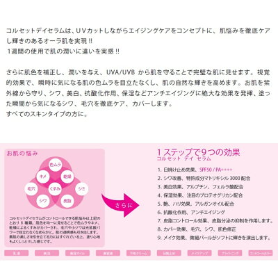 商品情報 商品説明 UVカットしながらエイジングケアをコンセプトに、肌の悩みを徹底ケアし輝きのあるオーラ肌を実現1週間の使用で肌の潤いに違いを実感1ステップで9つの効果・美白・乳液・美容オイル・美容液・下地クリーム・日焼け止め・メイクアップ・コントロールカラー日焼け止め効果はSPF50/PA++++肌色を均一に見せることで色むらやキメ、乾燥によるくすみがカバーされ、毛穴や小じわは光拡散パウダーで目立たなくなめらかに。
